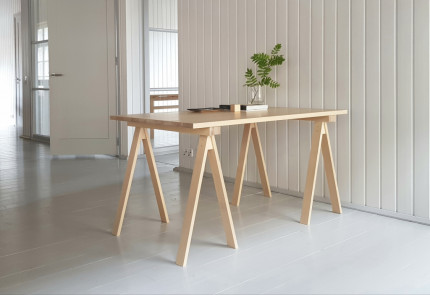 ARCITECTURE kolekcijos stalas yra komplektuojamas iš dviejų atskirų elementų: beržo masyvo stalviršio bei atraminių žirgių tipo kojelių. Jiems susivienijus prieš akis iškyla tvirtas, bet tuo pačiu ir be galo elegantiškas mišku dvasia alsuojantis stalas.