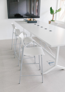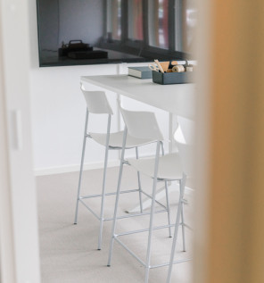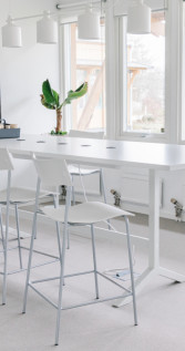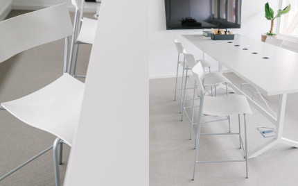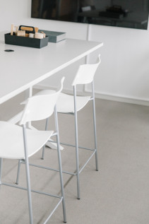 CAMPUS COUNTER/ BARSTOOL – baro arba pusbario aukščio kėdės versija keturiomis kojelėmis, natūralios faneros sėdimąja dalimi bei atlošu. Pageidaujant kėdę galima dalinai arba pilnai vilkti audiniu/ oda.