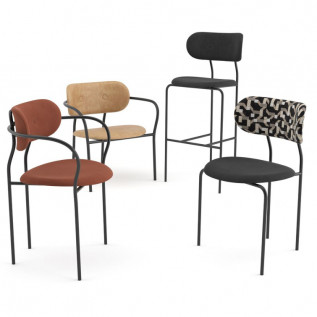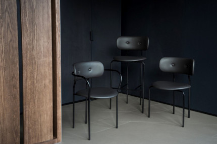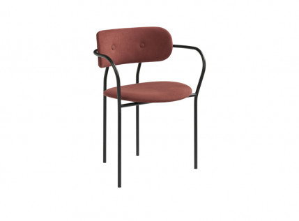 COCO DINING CHAIR WITH ARMREST – versija su paminkštinta sėdimąja dalimi bei atlošu, juodomis plieno detalėmis ir porankiais. Platus audinių bei odų pasirinkimas leidžia varijuoti baigtiniu kėdės pavidalu, susikurti išskirtinę COCO.
