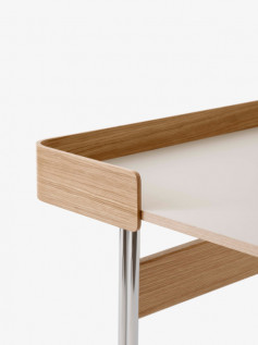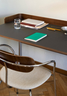 PAVILIONAV17 – stilingas rašomasis stalas, kurio stalviršis gali būti dengiamas įvairių spalvu Forbo linoleumu bei derinamas su chromuoto plieno kojelėmis. Šis modelio variantas taip pat išsiskiria stalviršio dalį dengiančiu skydeliu.