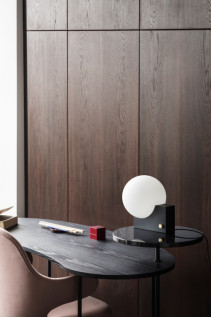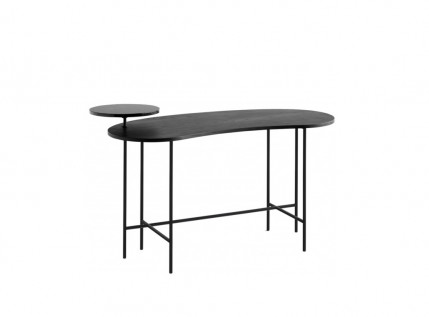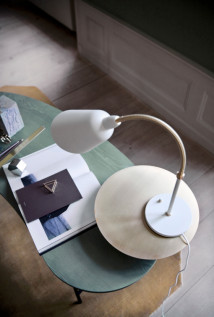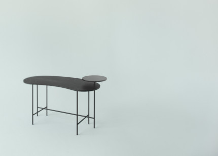PALLETTE JH9 – rašomasis stalas, kurio pupos formos didysis stalviršis, pagamintas iš lakuoto uosio lukšto, derinamas su apvaliu stalviršiuku, pakibusiu virš pagrindinio darbo paviršiaus. Mažasis stalviršis pasirinktinai gali būti pagamintas iš žalvario arba marmuro. Komponentus apjungia besikryžiuojančios dažyto plieno vamzdinės kojelės, savo grakštumu sustiprindamos mobilumo bei paslankumo įspūdį.