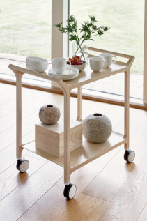 Stilingas ir funkcionalus serviravimo stalelis su nuimamu padėklu. Įvairūs apdailų derinimo variantai.