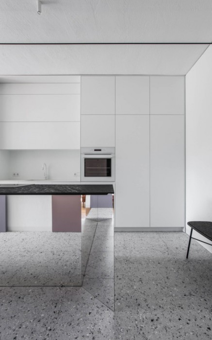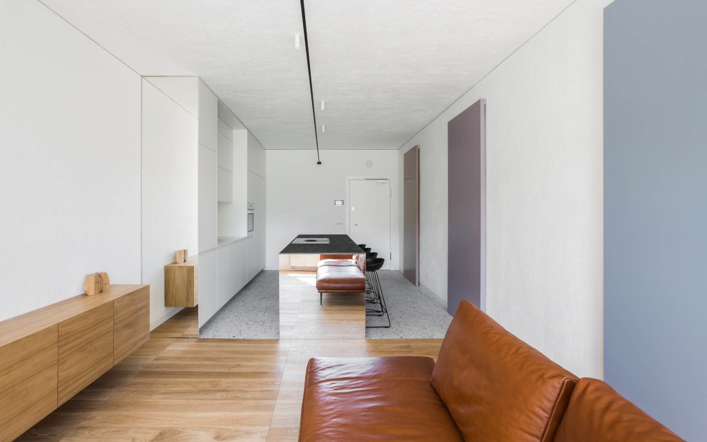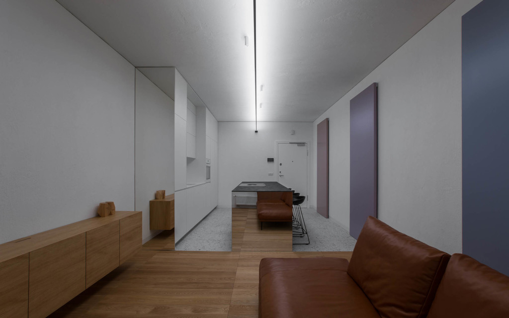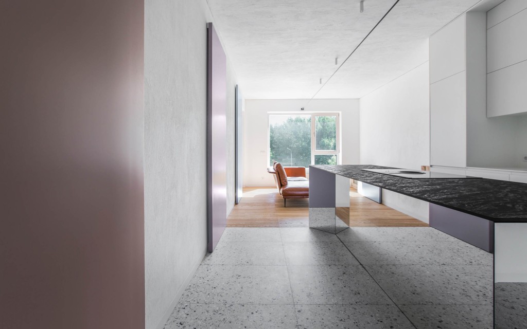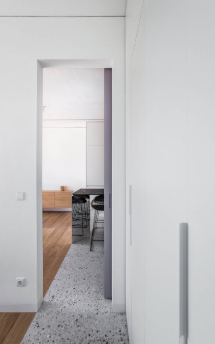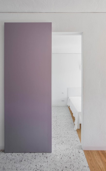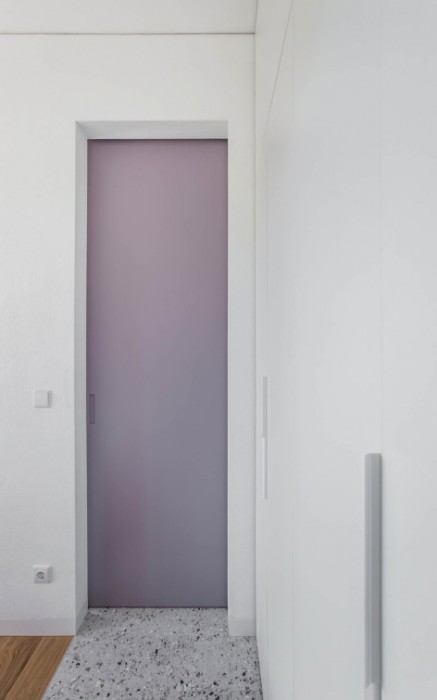 "Butas su vienomis netikromis durimis. Mažas ir spalvingas 45 kv.m. butas Vilniuje. Viena didelė erdvė su 3 durimis. Pirmosios durys priklauso vonios kambariui, antrosios priklauso miegamajam, o trečios priklauso jūsų vaizduotei. Trys spalvingos durys pagrindinėje erdvėje yra dideli abstraktūs paveikslai, suteikiantys žaismingumo nedideliam šiuolaikiškam interjerui. Vakarui atėjus, viena plona LED linija kerta visą pagrindinę gyvenamąją erdvę, nors dienos metu ir kelia klausimą: o kas tai? Mes mėgstame mažus butus, nes juos yra sudėtinga padaryti įsimintinus ir patrauklius."