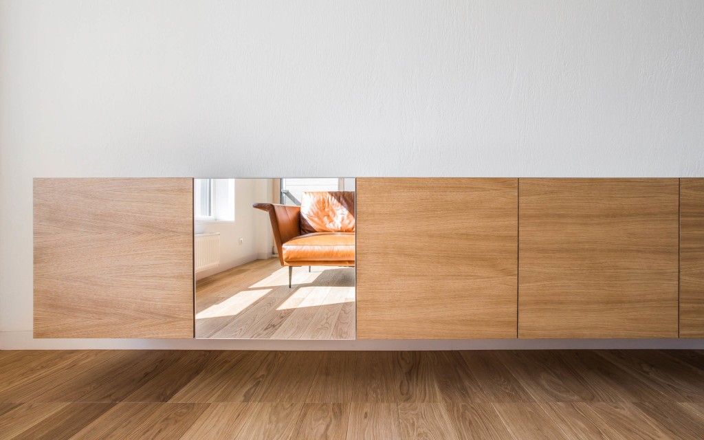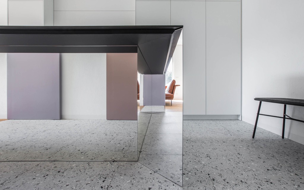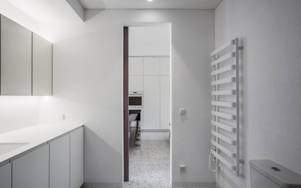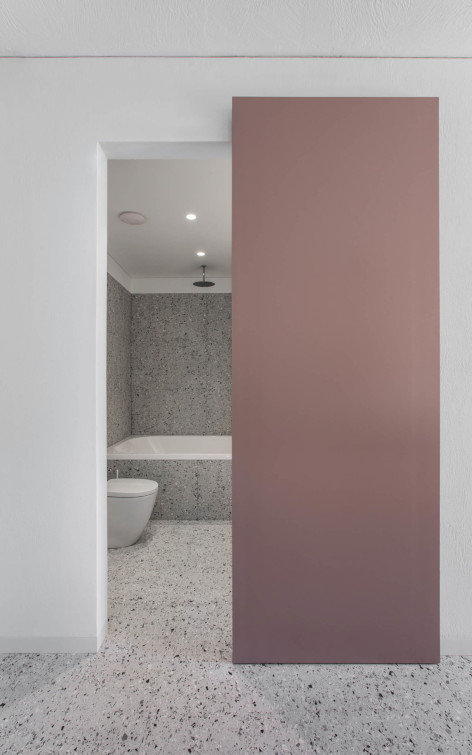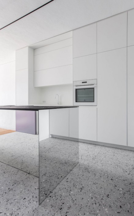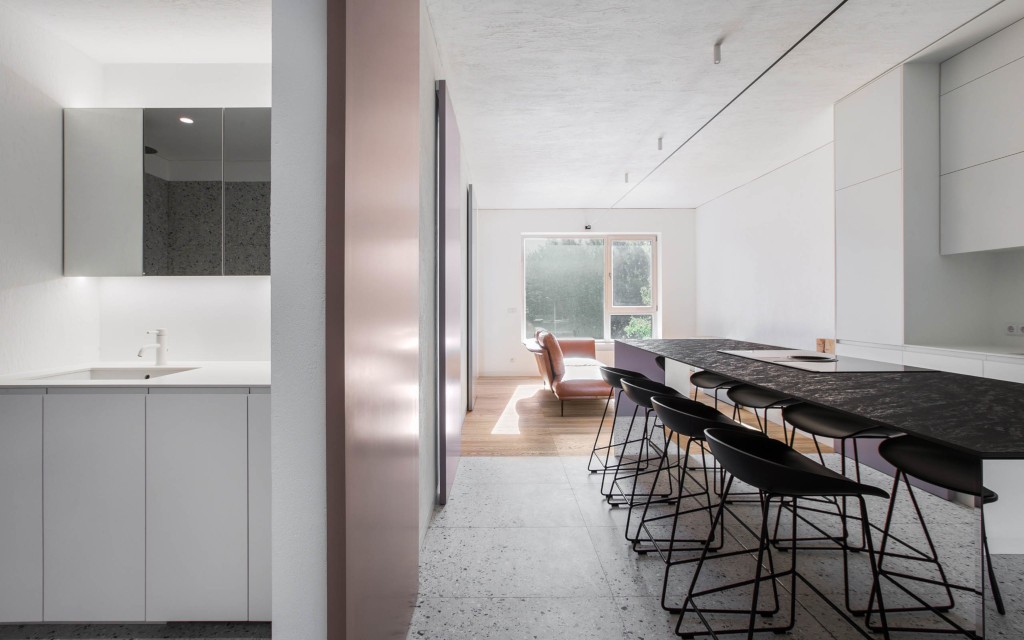 "Butas su vienomis netikromis durimis. Mažas ir spalvingas 45 kv.m. butas Vilniuje. Viena didelė erdvė su 3 durimis. Pirmosios durys priklauso vonios kambariui, antrosios priklauso miegamajam, o trečios priklauso jūsų vaizduotei. Trys spalvingos durys pagrindinėje erdvėje yra dideli abstraktūs paveikslai, suteikiantys žaismingumo nedideliam šiuolaikiškam interjerui. Vakarui atėjus, viena plona LED linija kerta visą pagrindinę gyvenamąją erdvę, nors dienos metu ir kelia klausimą: o kas tai? Mes mėgstame mažus butus, nes juos yra sudėtinga padaryti įsimintinus ir patrauklius."