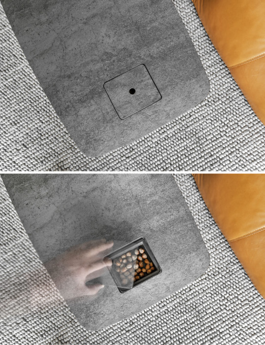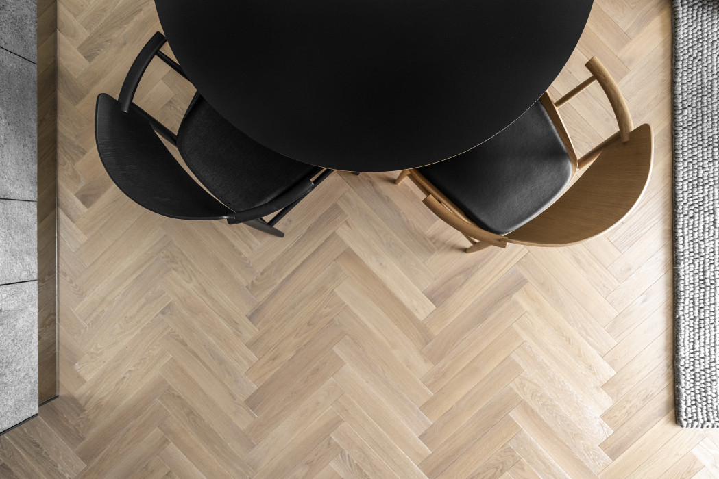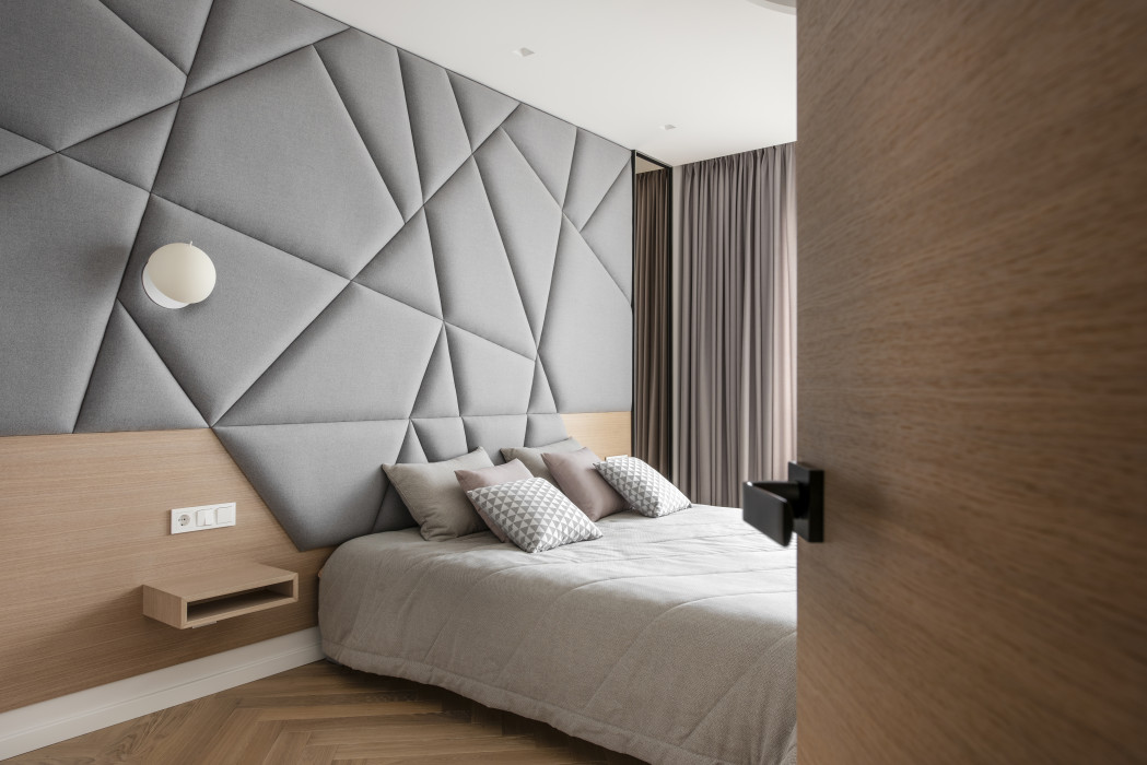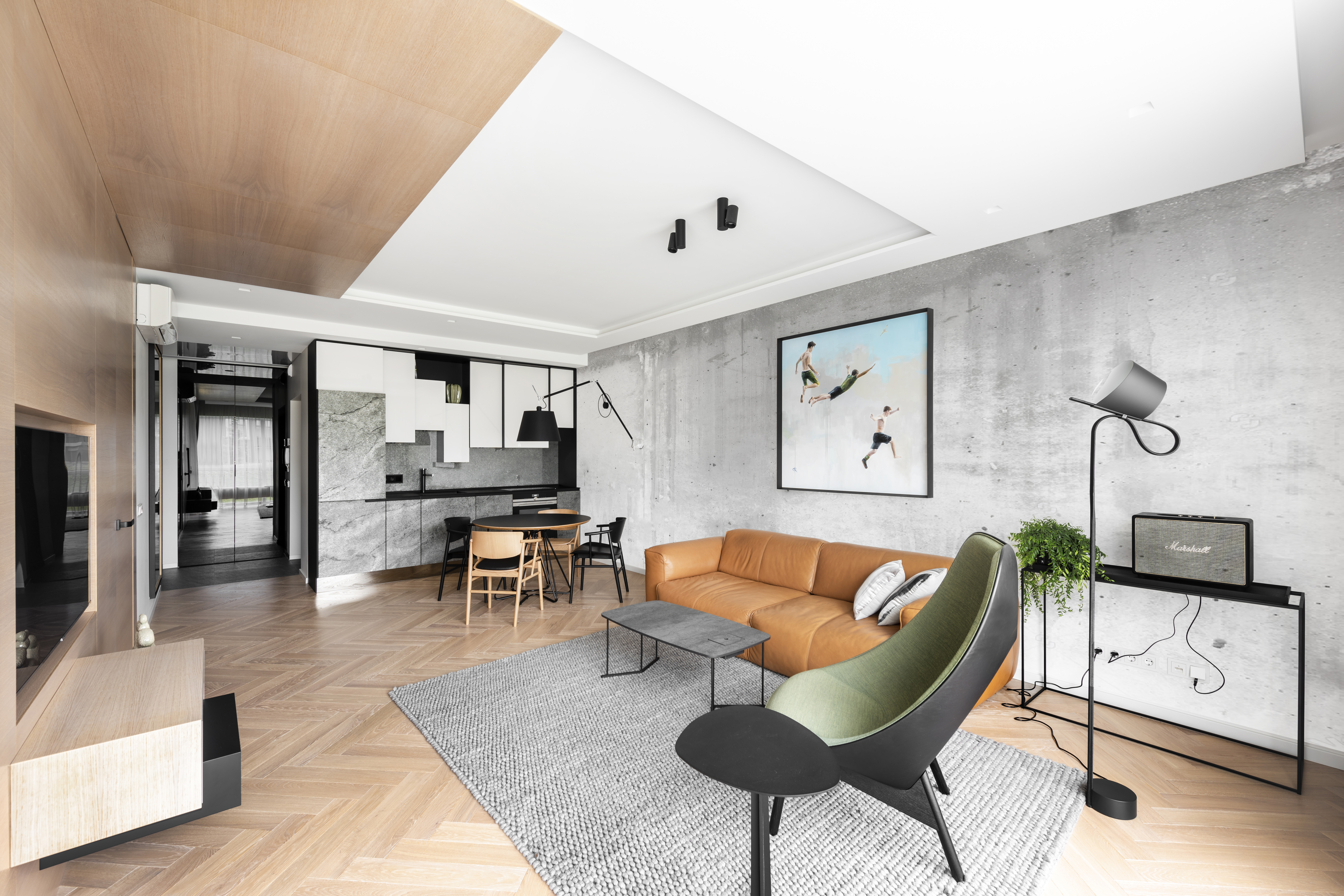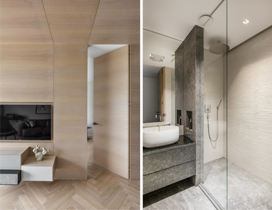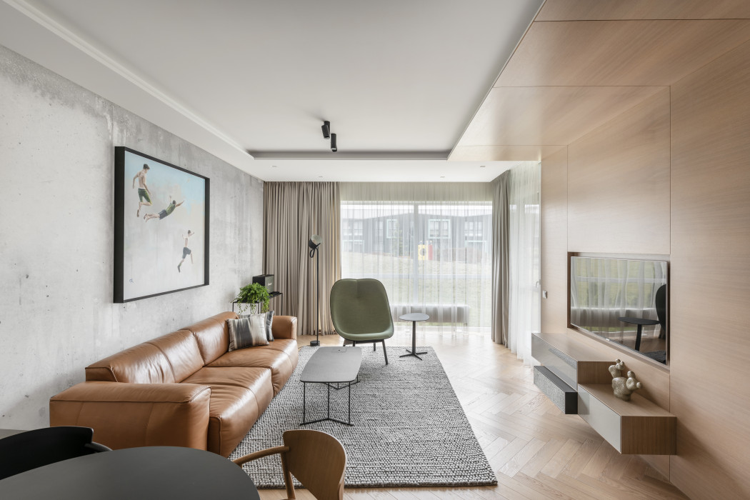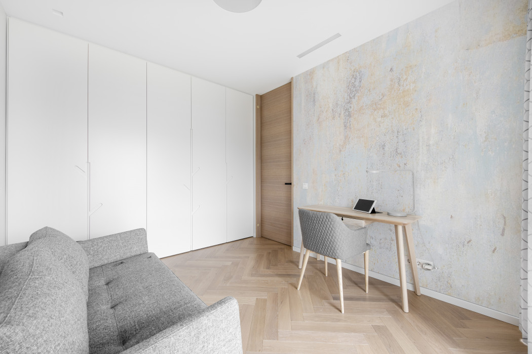 Nedidelis kompaktiškas modernaus dizaino butas. Suprojektuoti autoriniai baldai- virtuvės (panaudotos apdailos medžiagos – lakštinis skalūno akmuo. Miegamajo kambario lova , akustinė lovugalio – sienos dalis. Kavos staliukas – lengva metalinė stalo kojelių konstrukcija neįspaudžia kiliminės dangos , akmens keramikos stalviršis su paslėptu indu.Vonios kambario praustuvo baldas : stalviršis – poliruotas granitas su natūralaus skilimo briauna , stalčiai – granitas paviršius-natūralaus skilimo, struktūrinis.