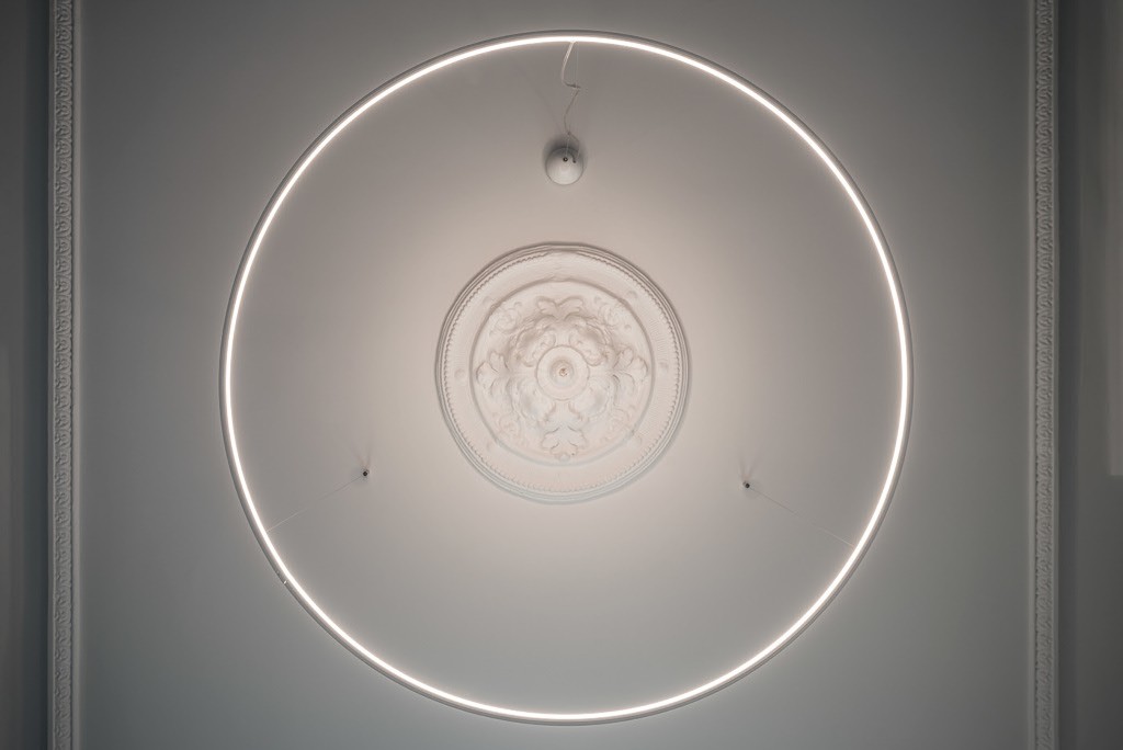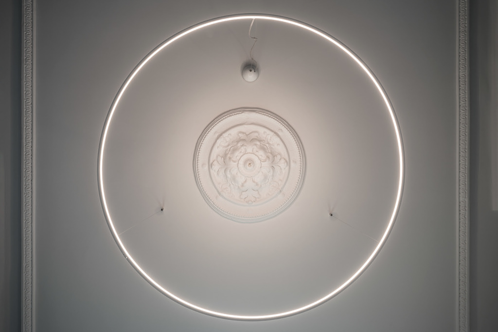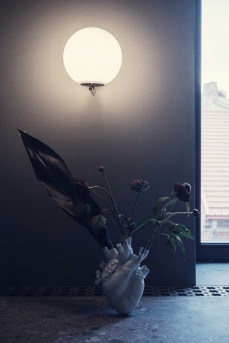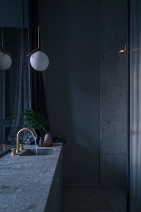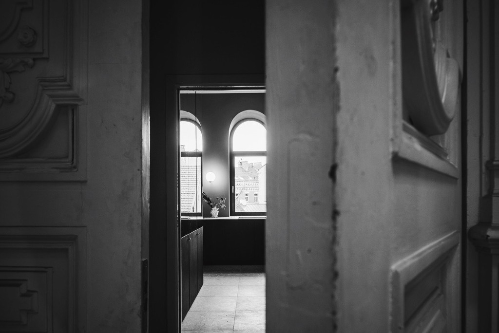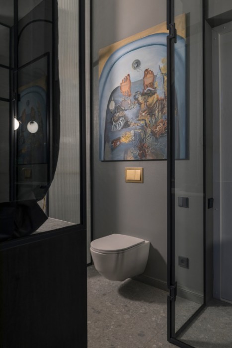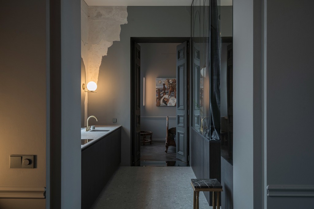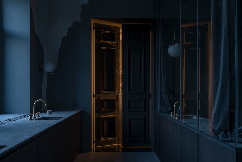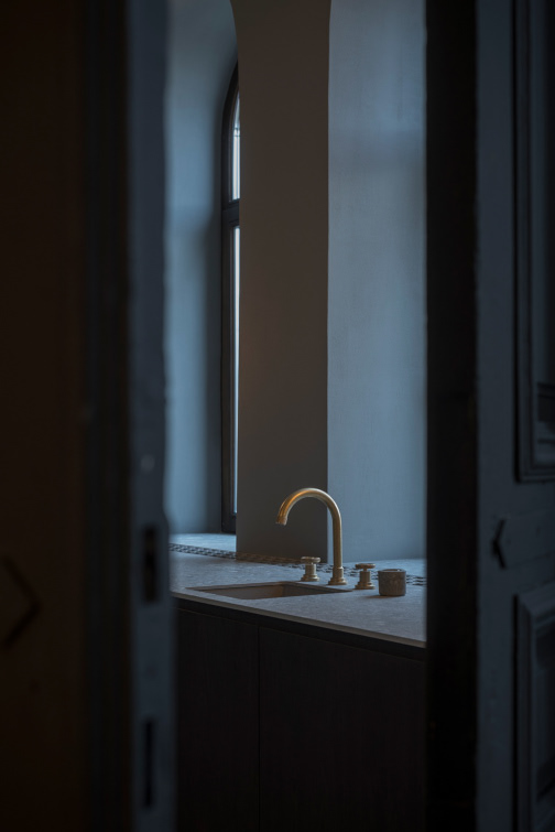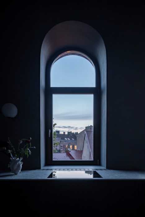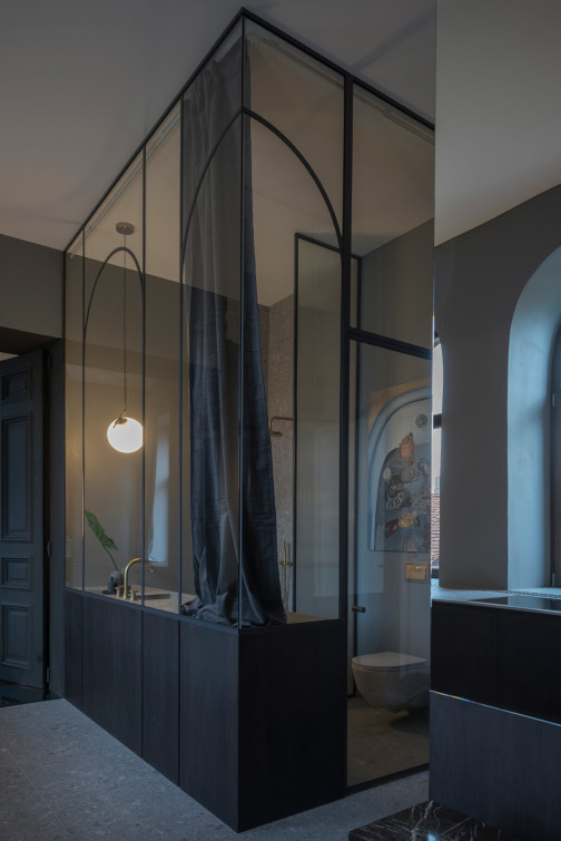 Laiptų teracas nejuntamai nusitęsia iki pat arkinių langų, lipdamas ant virtuvės ir vonios stalviršių. Ši ašinė erdvė, neišlaikiusi jokių autentiškų elementų, formuojama moderniomis ir lakoniškomis formomis. Riba tarp virtuvės ir vonios kambario tarytum ištirpsta per skaidrų stiklą, atsikartojančiais arkų ir varinių čiaupų motyvais. Malonus jausmas matyti aštuonis senamiesčio stogų sluoksnius tarsi tapybines lesiruotes tiesiog prausiantis duše.